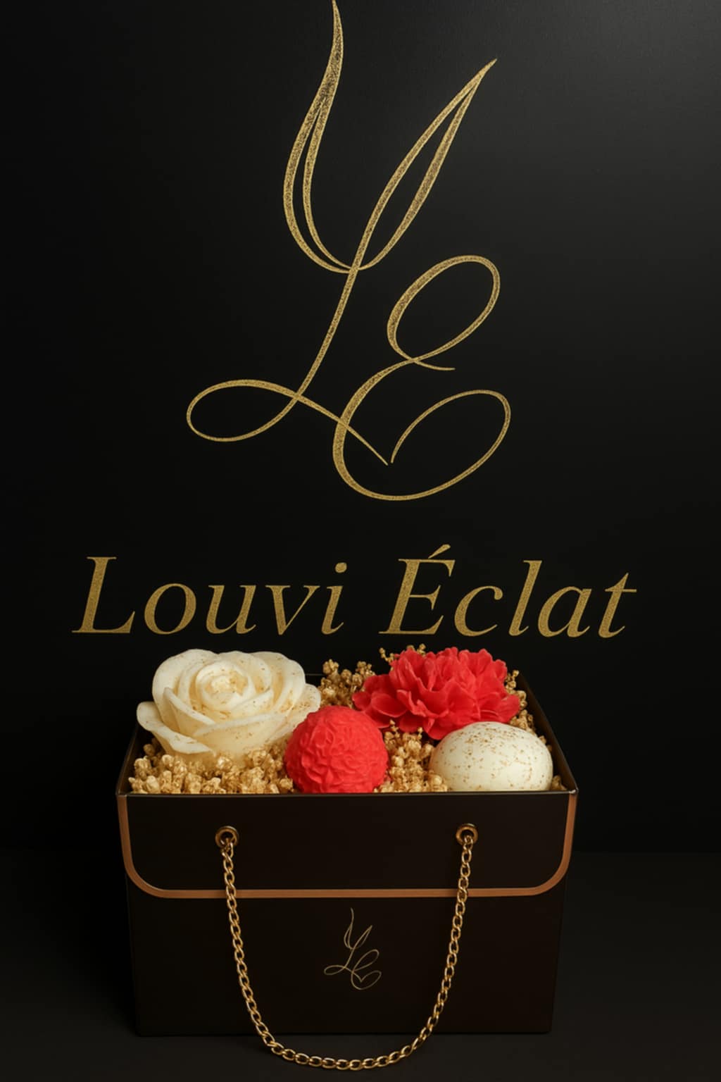 Είναι ένα κουτί κομψότητας και πολυτέλειας. Μέσα σε ένα μαύρο κουτί, διακοσμημένο με χρυσές λεπτομέρειες και μια κομψή αλυσίδα, βρίσκονται τρία κεριά σε σχήμα λουλουδιών: ένα λευκό τριαντάφυλλο και δύο κόκκινα γαρύφαλλα. Η σύνθεση ολοκληρώνεται με ένα λευκό κερί σε σχήμα καρδιάς και χρυσό διακοσμητικό υλικό, δημιουργώντας ένα μοναδικό δώρο που συνδυάζει την ομορφιά με την περιποίηση.