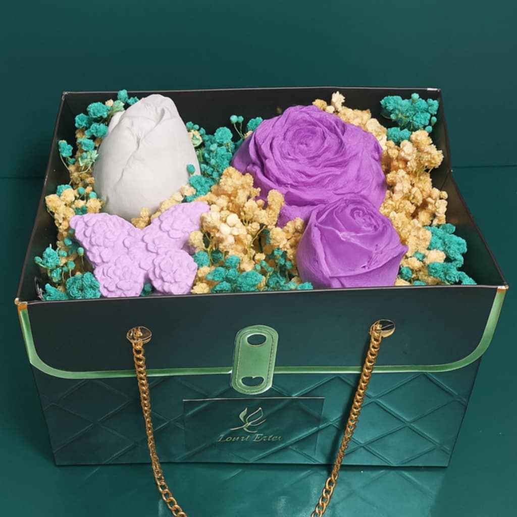 Είναι ένα κουτί κομψότητας και πολυτέλειας. Μέσα σε ένα μαύρο κουτί, διακοσμημένο με χρυσές λεπτομέρειες και μια κομψή αλυσίδα, βρίσκονται τρία κεριά σε σχήμα λουλουδιών: δύο μώβ τριαντάφυλλα και μία γκρί τουλίπα. Η σύνθεση ολοκληρώνεται με ένα ροζ κερί σε σχήμα πεταλούδας, δημιουργώντας ένα μοναδικό δώρο που συνδυάζει την ομορφιά με την περιποίηση.