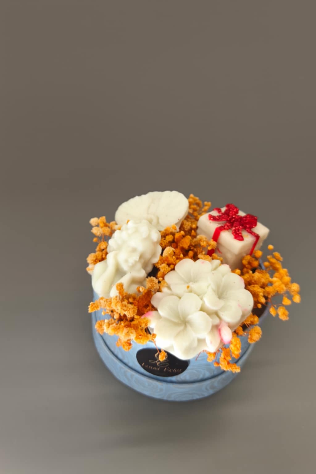 Χειροποίητη γιορτινή σύνθεση με φιγούρες από φυσικό κερί σόγιας και διακοσμητικά στοιχεία σε χρυσοκίτρινους τόνους. Τοποθετημένη σε κομψό κουτί, αποτελεί ιδανική επιλογή για δώρο ή για χριστουγεννιάτικη διακόσμηση. Διατίθεται μόνο σε άρωμα πορτοκάλι-κανέλα.