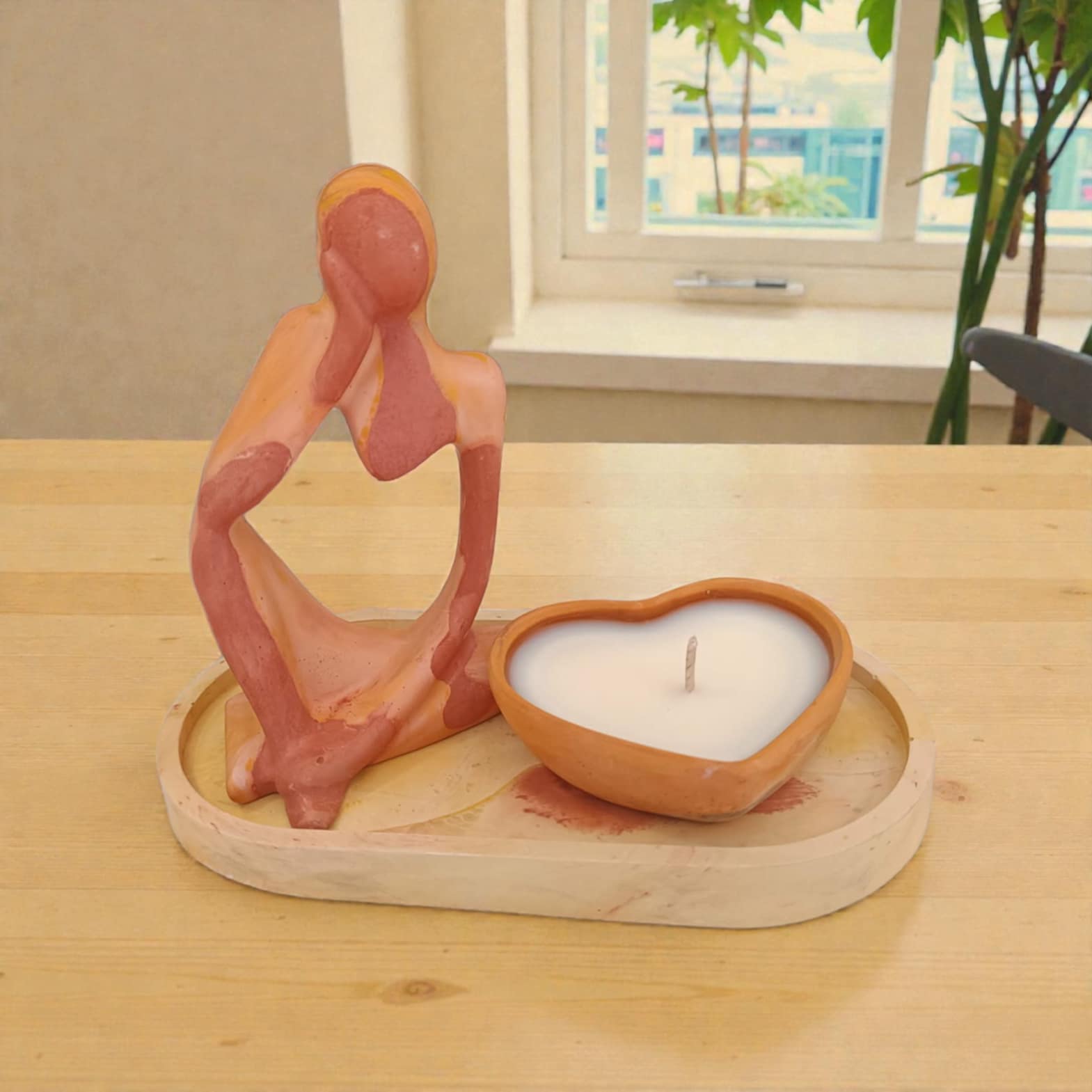Χειροποίητη διακοσμητική σύνθεση από γύψο, με αφαιρετική ανθρώπινη φιγούρα σε ζεστές γήινες αποχρώσεις και καρδιά με φυσικό κερί σόγιας.